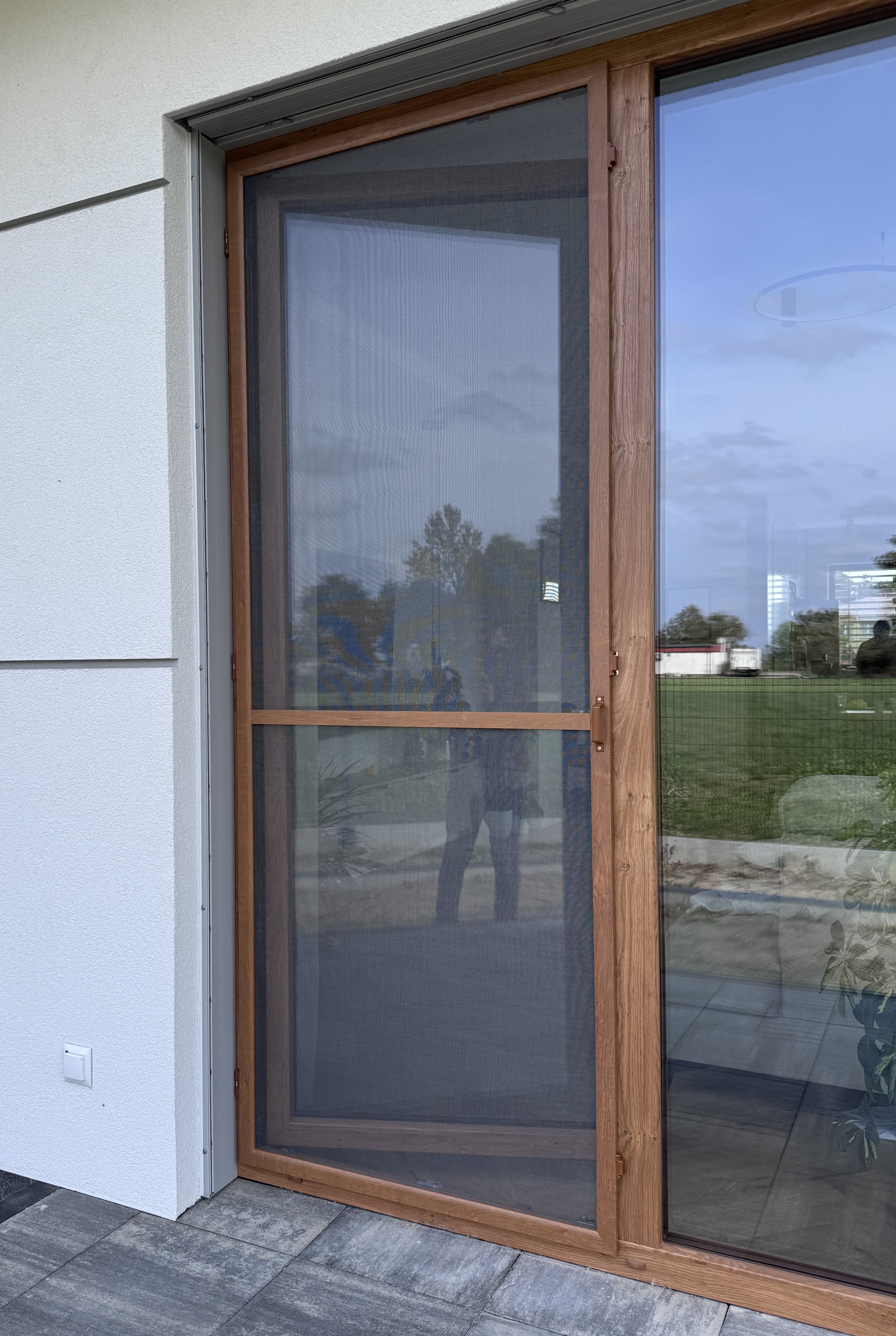 Design: Kolory dopasowane do stolarki (RAL i okleiny drewnopodobne) sprawiają, że moskitiera niemal znika na tle drzwi.